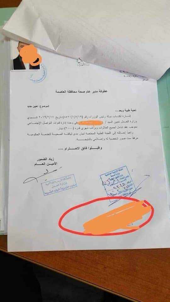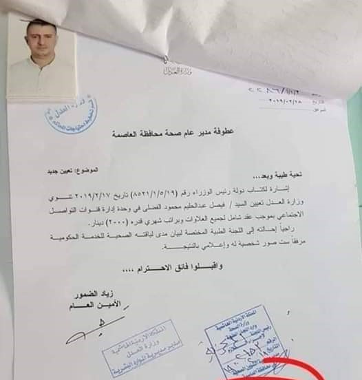 ووجه أمين عام وزارة العدل القاضي زياد الضمور كتاباً إلى مدير صحة العاصمة لاحالة الموظفين إلى اللجنة الطبية المختصة لبيان لياقتهما الصحية للخدمة الحكومية واعلامه بالنتيجة.