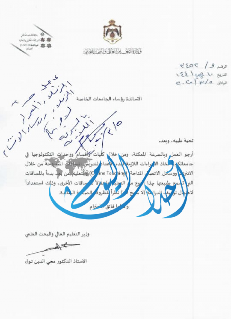 التعليم عن بُعد بالجامعات الأردنية بسبب كورونا - وثيقة