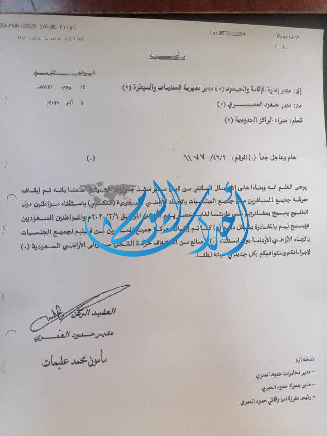 ووفق كتاب حصلت" أحداث اليوم " على نسخة عنه فإنّ الأردن أعلمت بوقف عبور كافة الجنسيات عبر الحدود السعودية باتجاهه ،واستثناء حركة الشحن من وإلى اراضي السعودية.