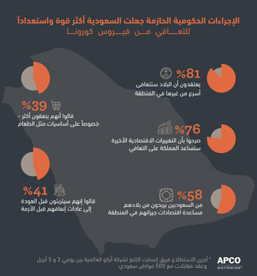 أظهر استطلاع رأي أجرته وحدة البحوث والدراسات في شركة آبكو العالمية حول التعاطي الشعبي في المملكة مع جائحة كورونا ثقة 81% من المستطلعين بأنها ستتعافى بسرعة أكبر من الدول الأخرى في المنطقة، وأن الإجراءات الحازمة والأسس الاقتصادية المتينة وحزمة التحفيز البالغة قيمتها عشرات مليارات الدولارات تضمن جهوزية المملكة للتعافي من آثار الوضع الراهن.