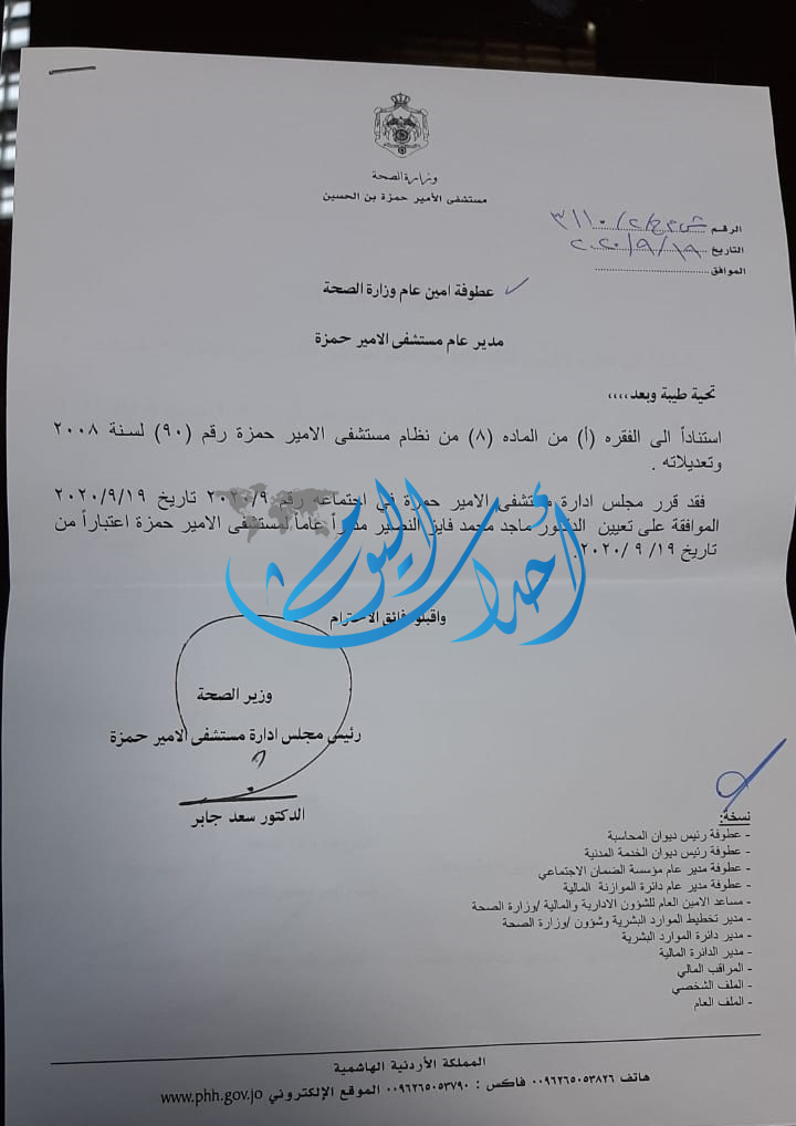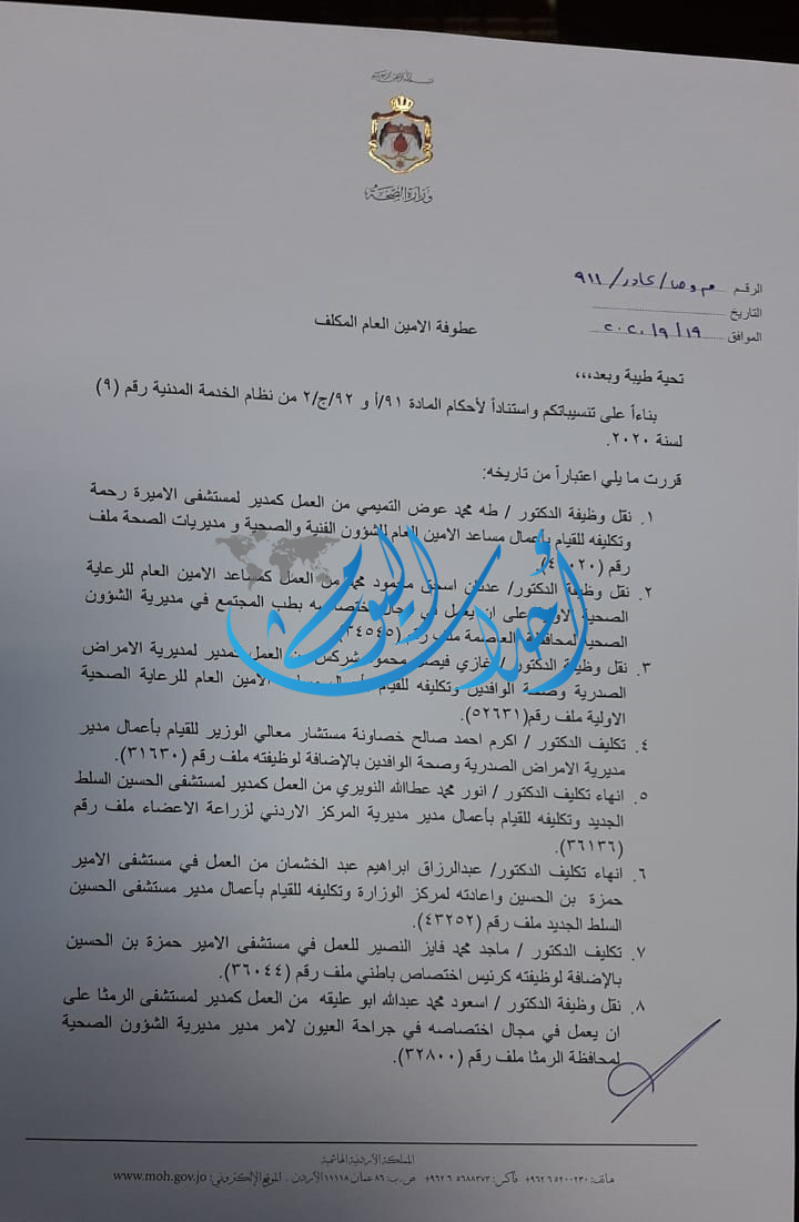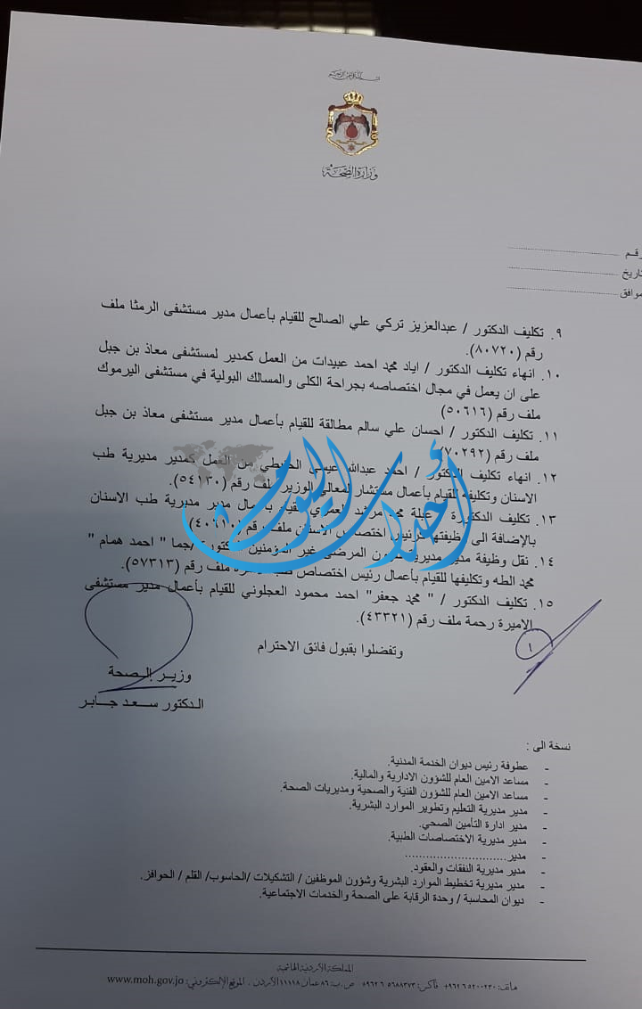 أحداث اليوم - اجرى وزير الصحة الدكتور سعد جابر تنقلات واسعة في وزارة الصحة. ومن أبرز التنقلات إعفاء عدنان إسحق من منصبه وإنهاء تكليف مدير مستشفى الامير حمزة عبدالرزاق الخشمان .