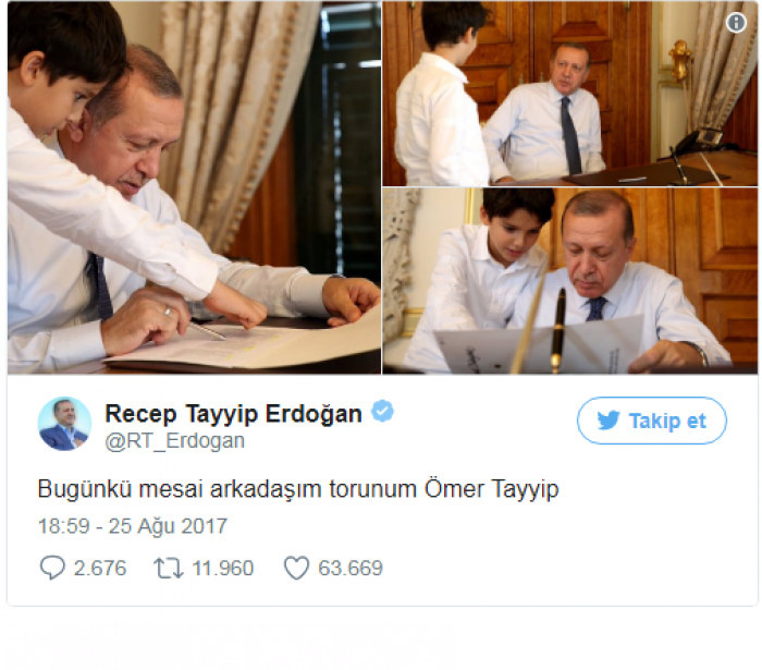 ونشر أردوغان 3 صور له مع حفيده وعلق فوقها قائلا: “رفيقي في العمل اليوم حفيدي عمر طيب”.