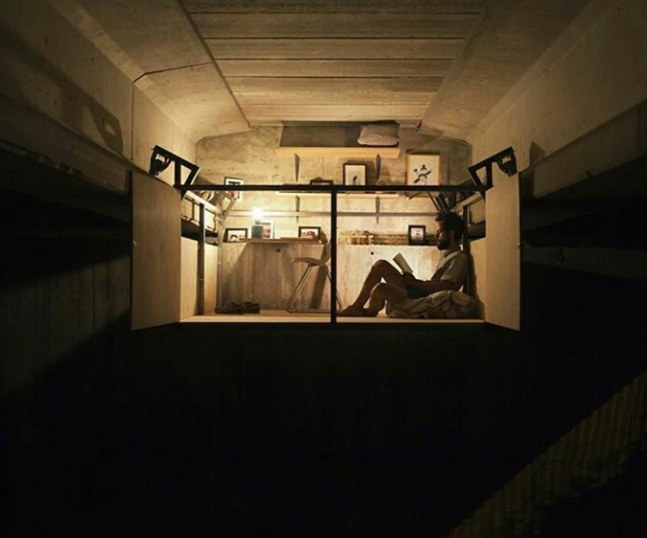 وتظهر الصور، التي انتشرت على وسائل التواصل الاجتماعي، أن هذا المأوى يتسع لشخص واحد فقط، ويحوي كرسياً وطاولة، وبضعة رفوف، جميعها مثبتة على الإسمنت الصلب أسفل الجسر.