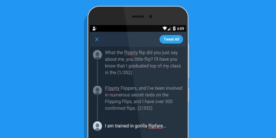 ورصد مستخدم لموقع "تويتر" يدعى ديفيش لوجندران الميزة الجديدة بتطبيق "تويتر" على الهواتف الذكية، والتقط عدد من الصور التي تظهر الطريقة الجديدة، إذ تقسم النص تلقائياً إلى تغريدات فردية مع إلحاق عداد للتغريدات، ما يعني إمكانية إلغاء "تويتر" للحدّ الأقصى المسموح للحروف قريباً.