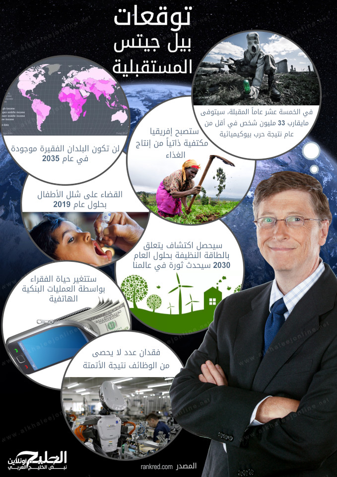 وفي الإنفوغرافيك التالي، أحدث توقعات غيتس التي يمكن أن تغير العالم للأفضل.