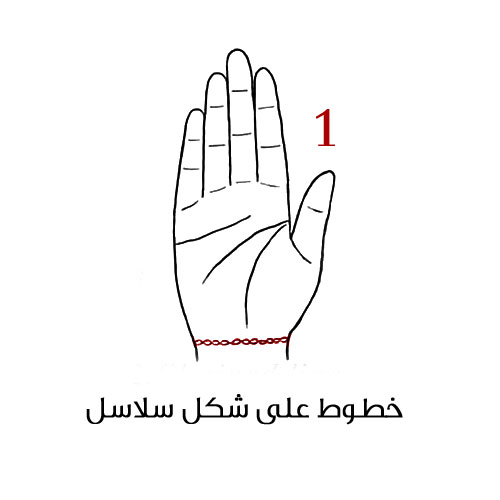 1- خطوط على شكل سلاسل في المعصم: هذا الشكل يشير إلى أنك مستقلة، عاملة مجتهدة وتفكرين بالغير. أنتِ شخص مذهل ولكن عندما يقع خطأ ما فإنك تغضبين بسرعة وتقسين على نفسك.