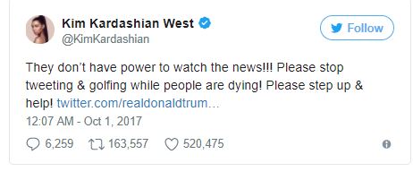 وكتبت كارداشيان "يرجى التوقف عن كتابة الرسائل على تويتر ولعب الغولف فعندما يموت الناس. يجب الوقوف والمساعدة".
