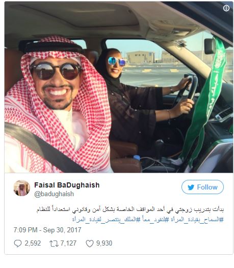 نشر مواطن سعودي على موقع التواصل الاجتماعي "تويتر" صورة له مع زوجته، وهو يساعدها في التدريب على قيادة السيارة، وذلك بعد الأمر السامي الذي أمر به الملك السعودي سلمان بن عبدالعزيز بالسماح للمرأة بإصدار رخص قيادة السيارات في السعودية.