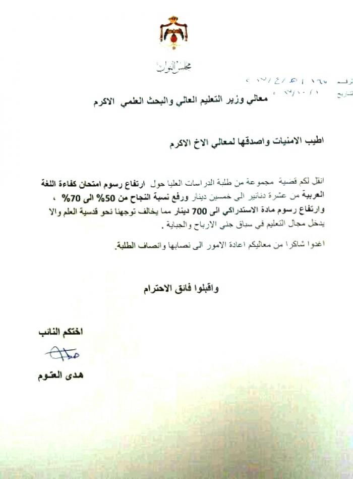 وجاء في العريضة التي وصلت للنائب العتوم أيضا اعتراض الطلبة على رفع نسبة النجاح من 50% إلى 70% وعلى رفع رسوم مادة الاستدراكي إلى 700 دينار .