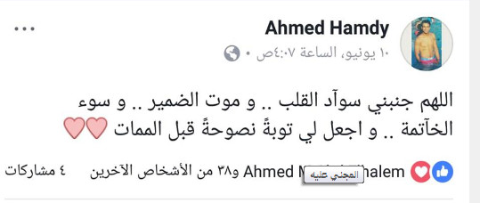 من جانب آخر، وعلى صفحته الشخصية على موقع "فيسبوك"، كانت آخر تدوينة كتبها اللاعب مؤلمة لمتابعيه، الذين استرجعوا التدوينة عقب إعلان مقتله. وكتب اللاعب يقول: "اللهم جنبني سواد القلب وموت الضمير وسوء الخاتمة واجعل لي توبة نصوحة قبل الممات".