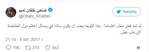 وأضاف في تغريدة ثانية أن "قطر لم تعد محل اهتمامنا"، مطالبا أن يتم تبني هذا التوجه وأن يكون سائدا في وسائل إعلام الدول المقاطعة للدوحة.