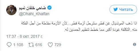 وقال خلفان في تغريدته: "إذا ذهب المونديال عن قطر سترحل أزمة قطر.. لأن الأزمة مفتعلة من أجل الفكة منه.. التكلفة عودة أكبر مما خطط تنظيم الحمدين".