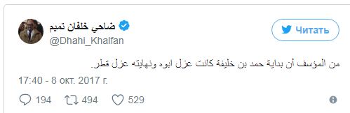 أما في تغريدة أخرى فقد أشار إلى أن نهاية قطر ستكون على يد أمير قطر السابق الشيخ حمد بن خليفة آل ثاني.