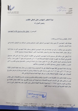 وإزاء ذلك فإننا نؤكد لدولتكم ان عدم السير في اجراءات اقرار النظام بالسرعة الممكنة يمس بشكل جوهري مصالح المهندسين الجدد والقدامى الذين لم يتقاعدوا بعد ويعرضه إلى عدم القدرة على الوفاء بالتزاماته المالية تجاه منتسبيه.