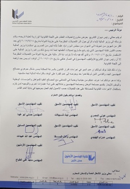 وإننا ندعو دولتكم لما عرف عنكم من حيادية وجدية في التعاطي مع المصالح العليا للمواطن والمؤسسات الوطنية والوطن للإيعاز بتقديم مصلحة الوطن ومصلحة المهندسين وعائلاتهم على اية اعتبارات اخرى والتوجيه لمن يلزم باستكمال الاجراءات القانونية للمصادقة على هذه التعديلات حسب الاصول ليتم العمل بموجبها في بداية العام القادم.