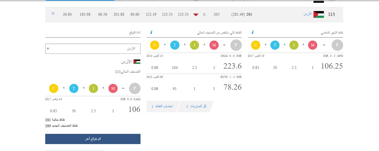 وكان المنتخب الوطني قد احتل المركز 110 في تصنيف الشهر الماضي برصيد 281 نقطة، حيث تعادل مع افغانستان ضمن تصفيات كاس اسيا 3-3 ، كما تعادل مع البحرين وديا في المنامة 0-0، لينقص رصيده التراكمي لينعكس ذلك على مركزه في التصنيف العالمي.