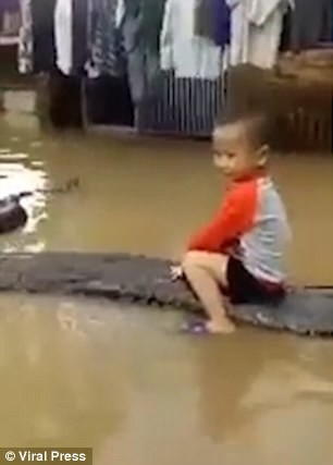 ويبلغ الطفل من العمر ثلاث سنوات وظهر راكبًا على ظهر ثعبان طوله ستة أمتار ووزنه 80 كيلوغرام ويركله كالحصان وذلك خارج منزله بفيتنام بينما تغمر مياه الفيضانات الشوارع التي كانت مسؤولة عن مقتل 54 شخصا وهد آلاف المنازل.