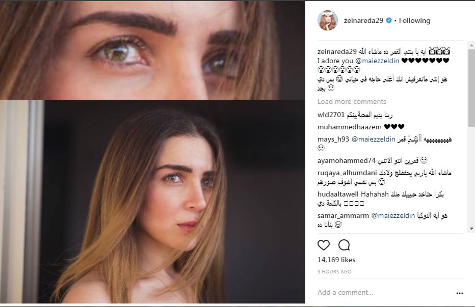 نشرت النجمة زينة عبر حسابها الشخصى بموقع تبادل الصور والفيديوهات الشهير 'إنستجرام'، صورة للنجمةمى عز الدين بدون مكياج وكتبت معلقة: 'إيه يا بنتى القمر ده ما شاء الله أنا بعشقك، هو أنتى ما تعرفيش أنك أغلى حاجة فى حياتى.. بس دى بجد'.