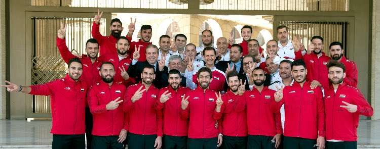 تداول رواد مواقع التواصل الاجتماعي صورا للاعبي المنتخب السوري خلال تكريمهم من قبل الرئيس السوري بشار الأسد.