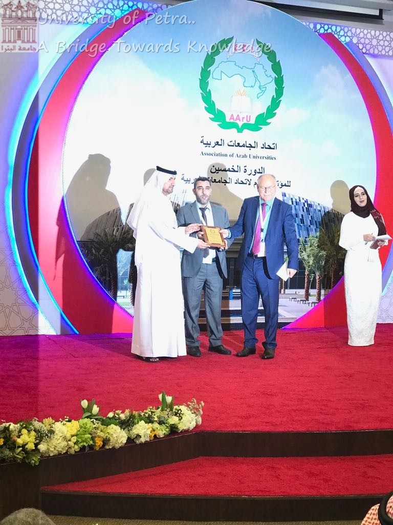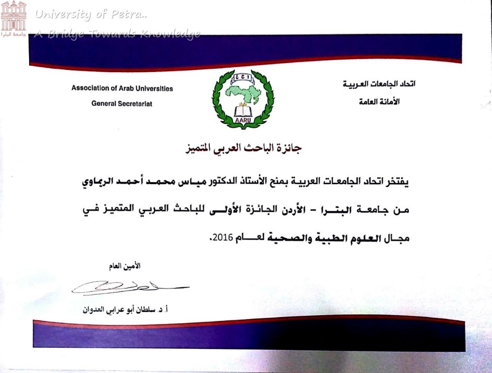 فاز الأستاذ المشارك في كلية الصيدلة جامعة البترا الدكتور مياس الريماوي بجائزة الباحث العربي المتميز المركز الأول، وسلم أمين عام اتحاد الجامعات العربية الدكتور سلطان أبو عرابي درع الجائزة وشهادتها إلى الريماوي في حفل أقيم في جامعة الإمارات العربية المتحدة في الإمارات.