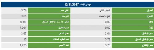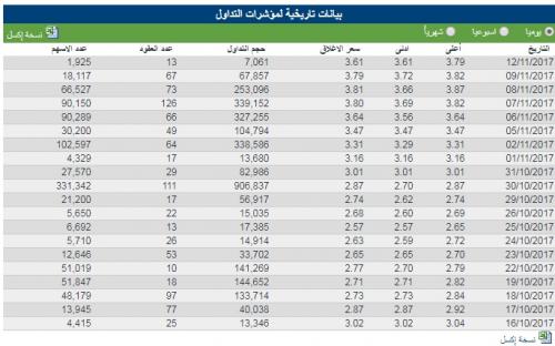 وبلغ ادنى سعر لسهم الشركة في جلسة التداول 3.61 فيما وصل أعلى سعر 3.79 وبنسبة تغيير عن سعر الاغلاق السابق بلغت -0.18%.