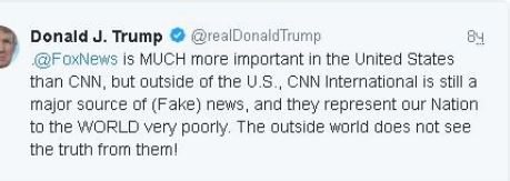 واشتعلت حرب التغريدات بين الرئيس الأمريكي دونالد ترامب وشبكة الأخبار الأميركية على شبكة التواصل الاجتماعي "تويتر"، إثر نشر ترامب تغريدة هاجم فيها شبكة CNN، قائلا إنها تعد مصدرا مهما للأخبار الكاذبة تعطي صورة سيئة عن الولايات المتحدة للعالم.