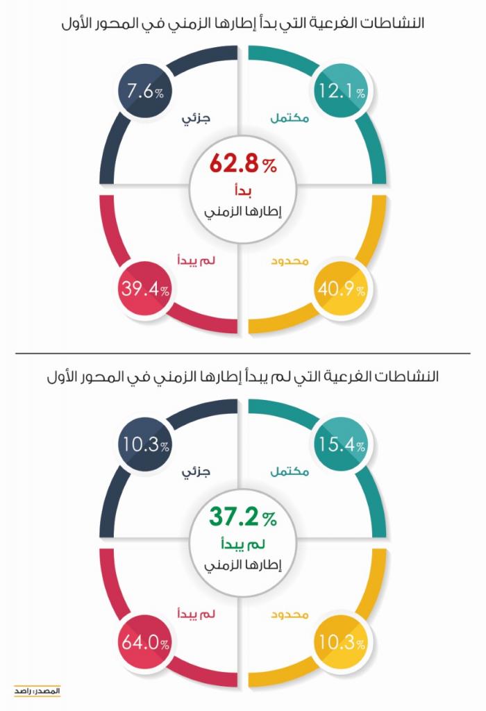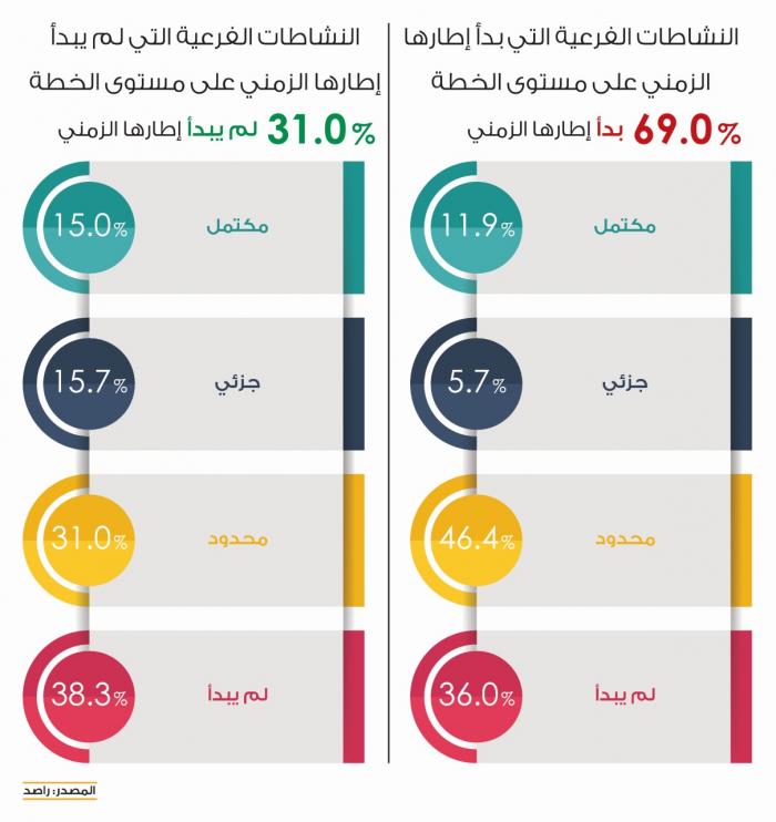 وتحققت ١٥٪ من أنشطة الخطة التي لم يبدأ إطارها الزمني خلال فترة التقرير، بشكل كامل رغم عدم بدء الإطار الزمني المخصص لتنفيذها وهذا يعتبر قيمة مضافة وإنجاز يسجل للجهات القائمة على تنفيذ الخطة،