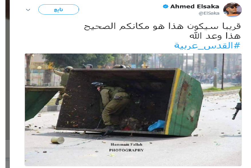 وجاء ذلك من خلال نشر السقا صورة معبّرة جدا وحقيقية، عبر صفحته الخاصة على أحد مواقع التواصل الإجتماعي جداً معبّرة وحقيقيّة، بدا فيها جندي إسرائيلي محتل وهو يحتمي وراء مكب للنفايات أثناء إحدى المواجهات.