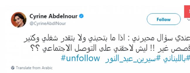 وغرّدت سيرين: "عندي سؤال محيرني: اذا ما بتحبني ولا بتقدر شغلي وكتير قصص غير!! ليش لاحقني على التواصل الاجتماعي؟؟ باللبناني "unfollow".