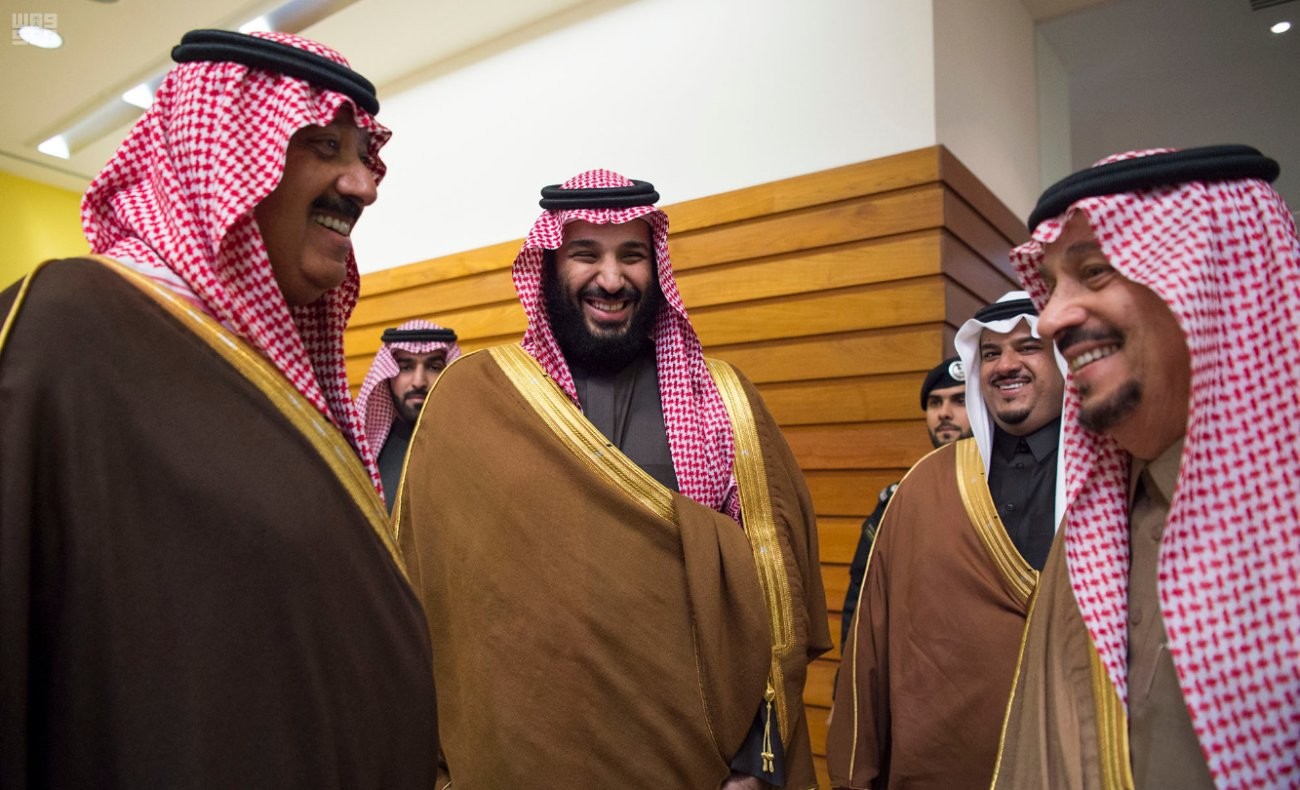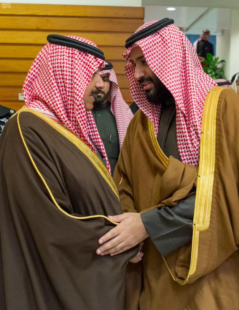 وظهر في الفيديوهات والصور، التي تم بثها، حديث بين بن سلمان والأمير متعب تخلله ابتسامات متبادلة.