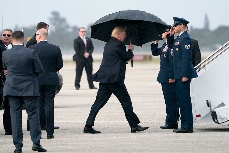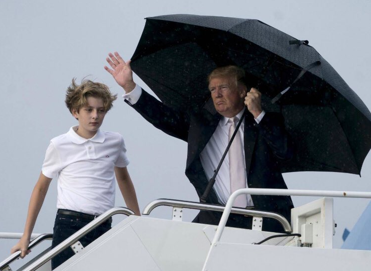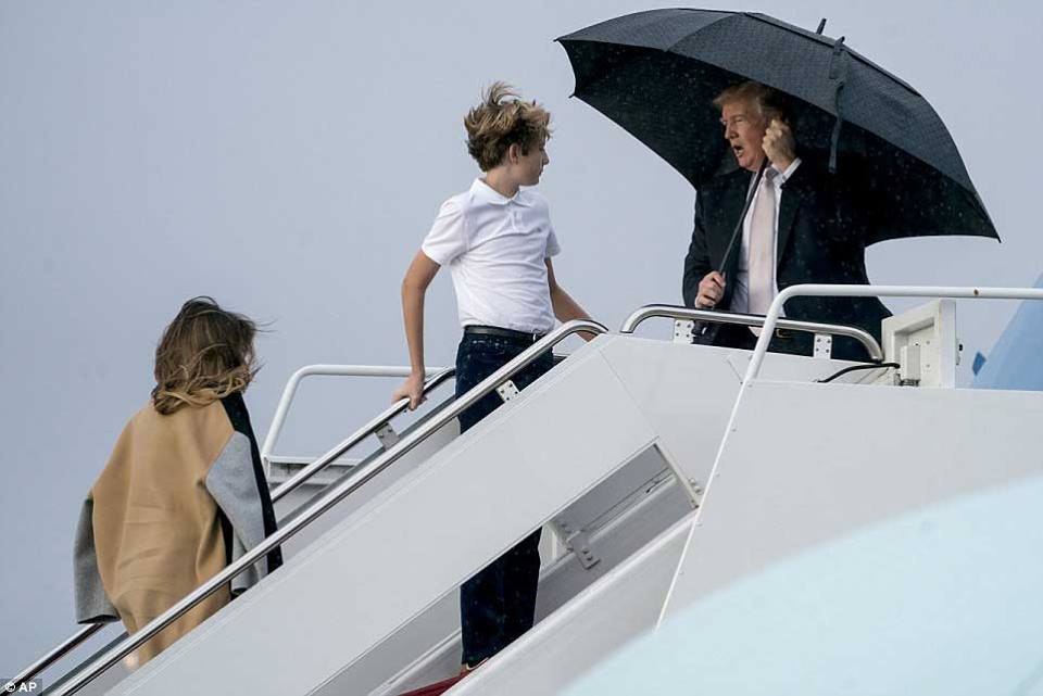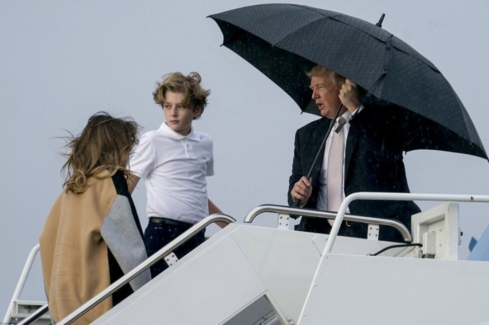 بالصور: ترامب يحمي نفسه من المطر ويترك خلفه زوجته وابنه !!