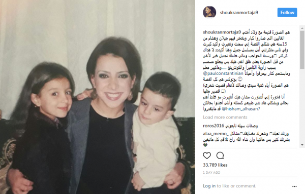 عبر حسابها الرسمي على تطبيق "انستغرام"، نشرت الممثلة السورية شكران مرتجى، صورة قديمة ونادرة لها، برفقة أبناء شقيقتها.