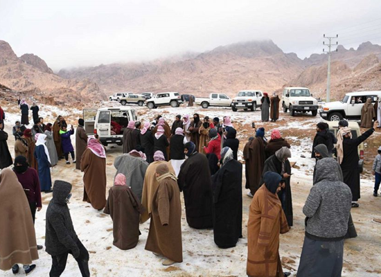 واكتظت قم جبال اللوز في تبوك السعودية بالمتنزهين والمتزلجين، بعد أن اكتست بالبساط الأبيض بفعل تساقط كميات كبيرة من الثلوج.