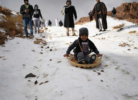 احتفى السعوديون بتساقط الثلوج على المناطق الجبلية التابعة لمحافظة تبوك، في حدث أصبحوا يترقبونه سنويا.