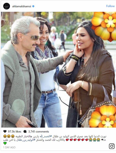 ونشرت أحلام صورة لها مع الأمير على صفحتها الرسمية بموقع "إنستغرام"، وكتبت قائلة: "نورت الدنيا كلها بعد عمري. الأمير الوليد بن طلال.. الحمد لله يازين هالأخبار الطيبة.. ياااااارب لك الحمد والشكر الوليد بن طلال يا أحن قلب."