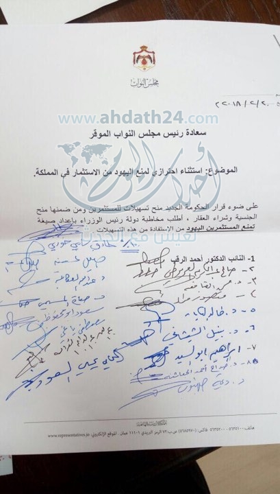 ووقع 17 نائباً مذكرة عبر رئيس المجلس تطالب الحكومة باجراء احترازي يقضي باصدار تعليمات لمنع اليهود من الاستفادة من التسهيلات التي قدمتها الحكومة للمستثمرين مقابل الحصول على الجنسية الاردنية .