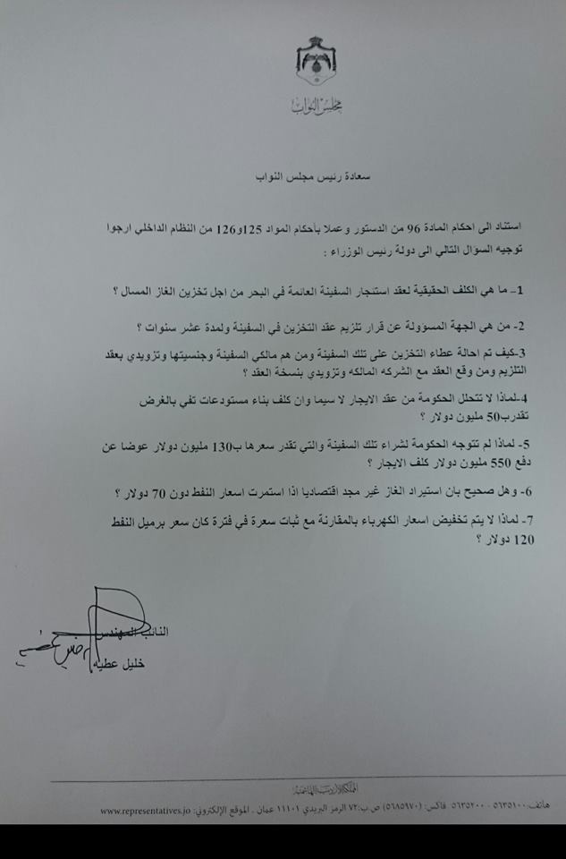 وجه النائب خليل عطية ، سؤالا ساخنا الى الحكومة عن سبب عدم شراء الحكومة للسفينة العائمة في العقبة من اجل تخزين الغاز المسال ، البالغ سعرها نحو 130 مليون دولار بدلا من دفع 550 مليون دينار بدل كلف اسئجار .
