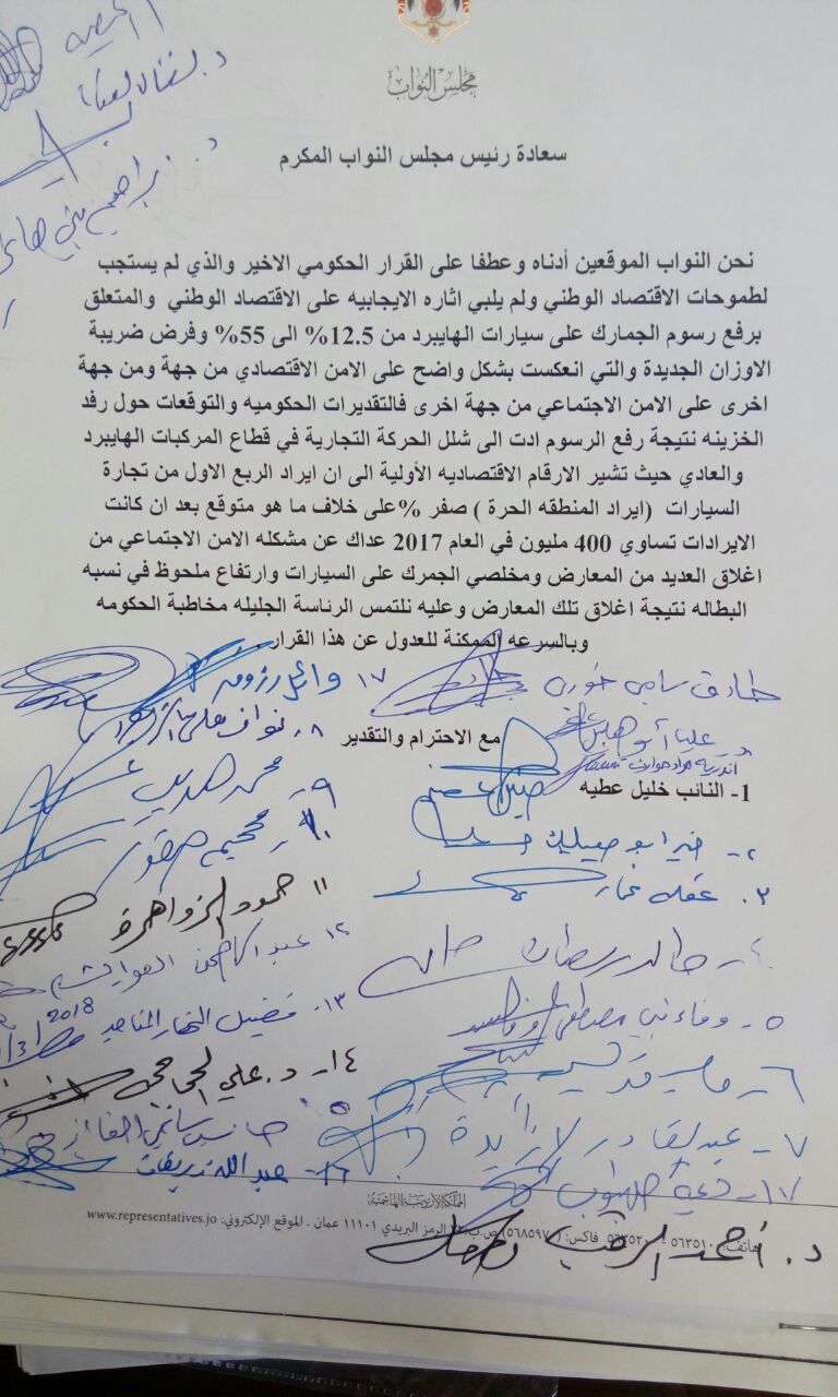 ووقع على المذكرة 33 نائبا لمطالبة الحكومة بالعدول عن القرار الذي تسبب بشل الحركة التجارية في قطاع المركبات الهايبرد والعادي .