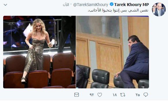 نشر النائب طارق خوري تغريدة مضحكة عبر تويتر، ارفقها بصورة للممثلة الأمريكية جينيفر لورانس، والنائب يحيى السعود.