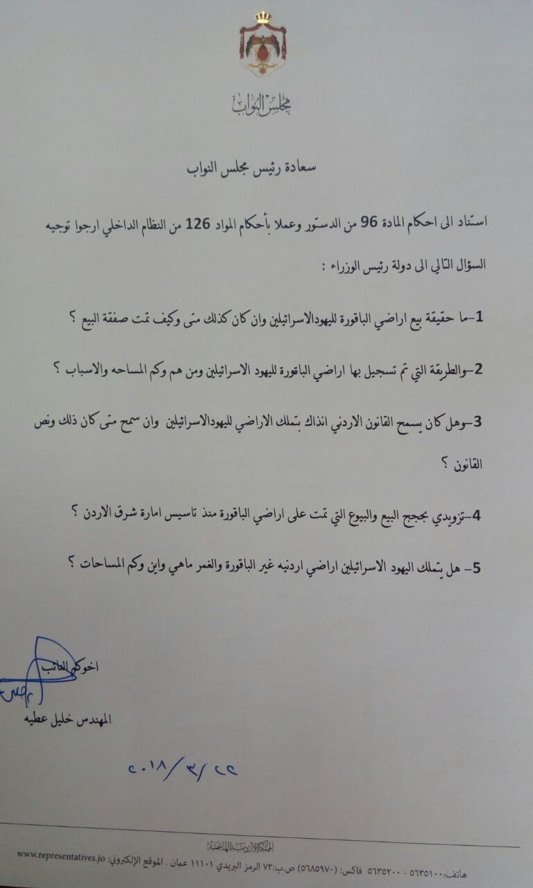 وجه النائب خليل عطية مذكرة نيابية الى رئيس الوزراء د. هاني الملقي تتضمن عدة اسئلة حول حقيقة بيع وتأجير اراضي الباقورة والغمر المؤجرة لليهود ، وذلك سندا لاحكام المادة (96) من الدستور وعملا باحكام المادة 126 من نظام مجلس النواب.