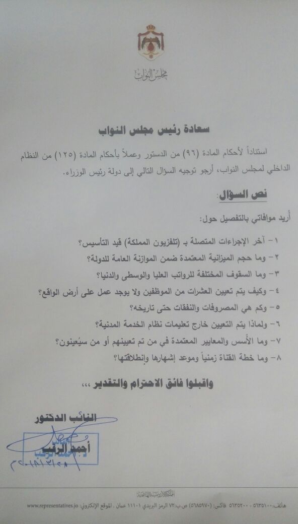 وجه النائب أحمد الرقب، سؤالا نيابيا لرئيس الوزراء هاني الملقي حول تلفزيون المملكة.