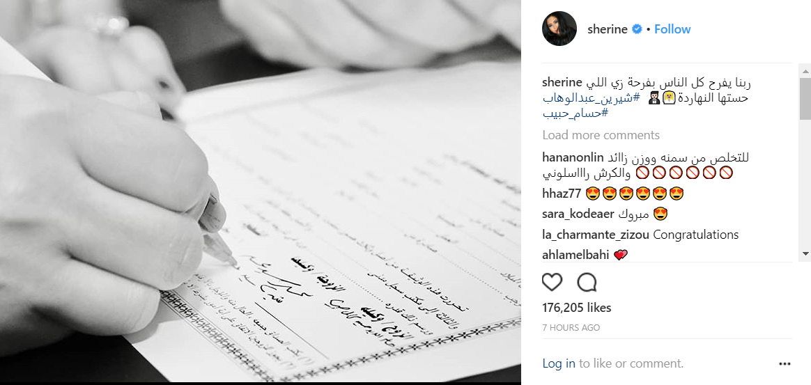 إلا أن شيرين بعد ساعات من انتهاء #عقد_القران، علقت للمرة الأولى على زواجها، من خلال حسابها على “إنستغرام” بعدما نشرت صورة لقسيمة زواجها وعلقت عليها قائلا “ربنا يفرح كل الناس بفرحه زي اللي حستها النهارده”.