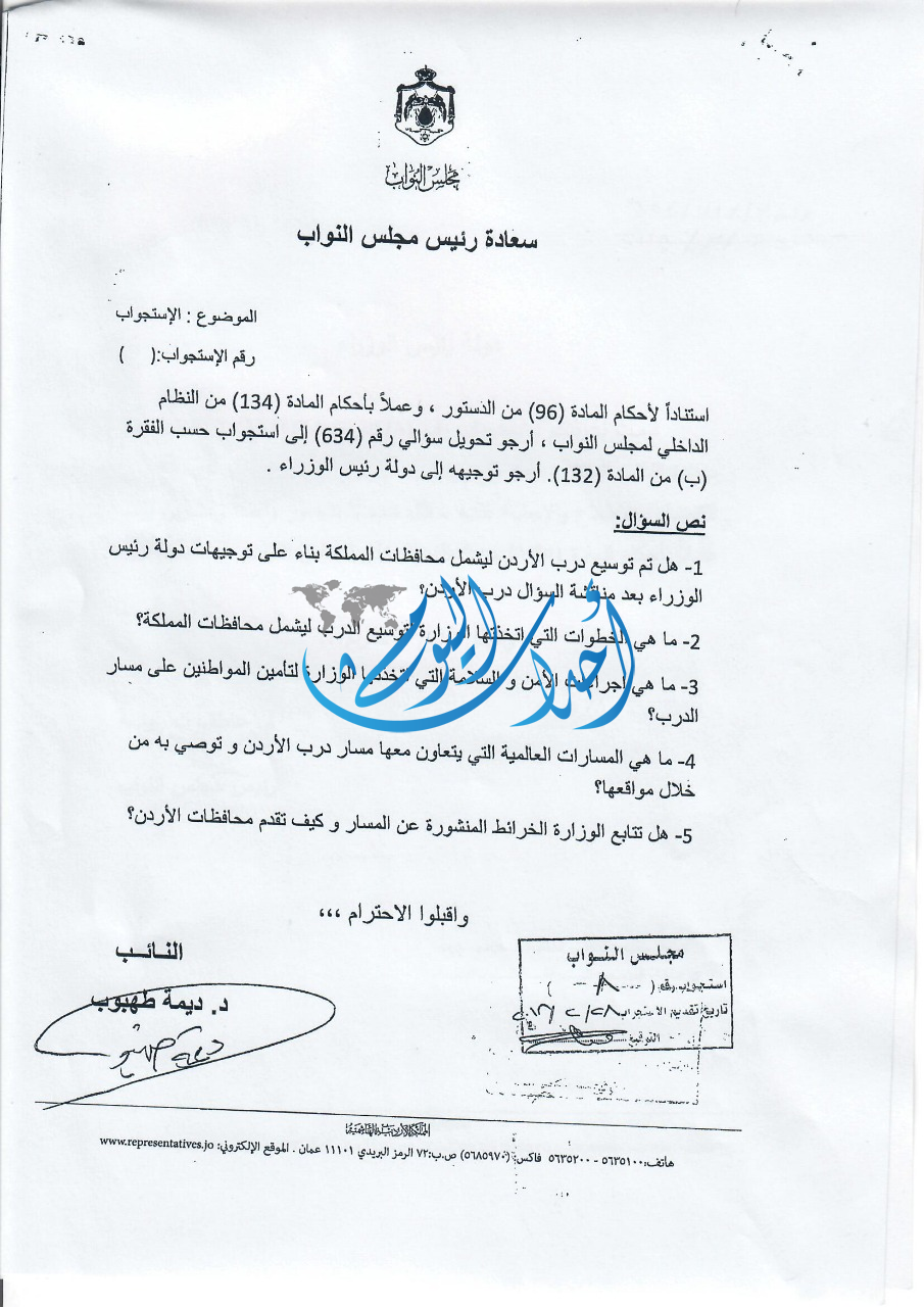 قالت النائب ديمة طهبوب أن رئيس الوزراء هاني الملقي تعهد بالطلب من وزيرة السياحة توسيع مسار المشروع السياحي المسمى درب الأردن ليشمل كافة محافظات ومناطق المملكة ووضع خطة لأجل ذلك ، وأضافت طهبوب أن الوزارة لم تزودها حتى اللحظة بأي معلومة حول ما طلبه رئيس الوزراء ، الأمر الذي جعلها تحول السؤال إلى استجواب قدمته منذ أشهر ولم يجب رئيس الوزراء عليه رغم مرور المدة المقررة قانونيا لذلك .