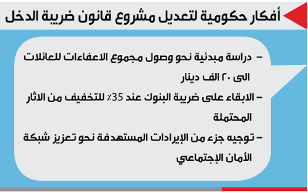 كشفت مصادر مطلعة بأن هنالك تفكيرا حكوميا بدأ يتبلور نحو إجراء بعض التعديلات على مشروع قانون الدخل الجديد بزيادة الإعفاءات للعائلات والأفراد وإبقاء نسبة الدخل على البنوك عند 35 %.