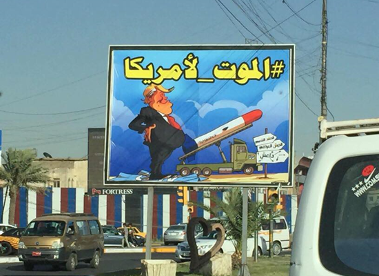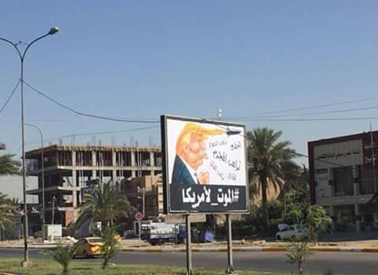 تناقل نشطاء على مواقع التواصل الاجتماعي، الاثنين، صورا للوحات كبيرة انتشرت في شوارع العاصمة العراقية بغداد، عليها صورة ساخرة للرئيس الأمريكي دونالد ترامب، وتحمل شعار "الموت لأمريكا".