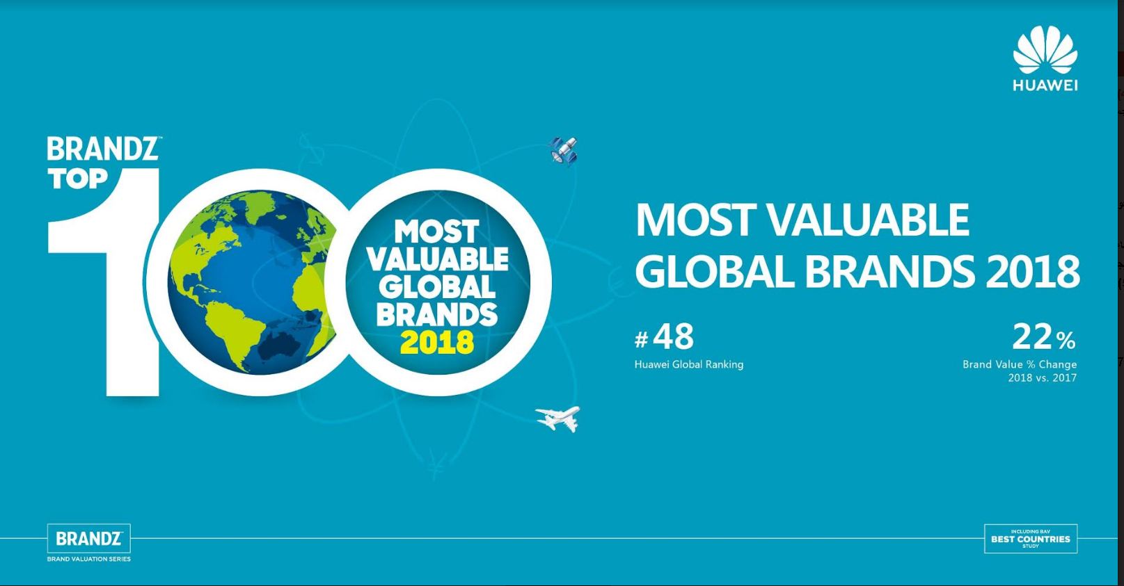 وتعد هواوي حالياً إحدى العلامات التجارية الرائدة عالمياً في مجال التكنولوجيا. وبفضل الحضور المتنامي لعلامتها التجارية، نجحت هواوي للعام الرابع على التوالي في دخول قائمة ’براندز‘ لأكثر 100 علامة تجارية عالمية قيمة. وشهدت قيمة العلامة التجارية للشركة وتصنيفها نمواً مطّرداً على أساس سنوي نتيجة للحضور القوي لهواتفها الذكية وأجهزتها اللوحية، فضلاً عن التوسع العالمي اللافت. ووصل إجمالي قيمة العلامة التجارية بحسب قائمة ’براندز‘ لأفضل 100 علامة تجارية إلى 4.4 تريليون دولار أمريكي، ما يمثل نمواً بنسبة 204% خلال الأعوام الـ 12 الماضية. وبلغ إجمالي النمو الصافي لجميع العلامات التجارية المدرجة ضمن القائمة حوالي 750 مليار دولار أمريكي، حيث نجحت جميع فئات العلامات التجارية المدرجة على القائمة في تحقيق نمو كامل للمرة الأولى في تاريخها.