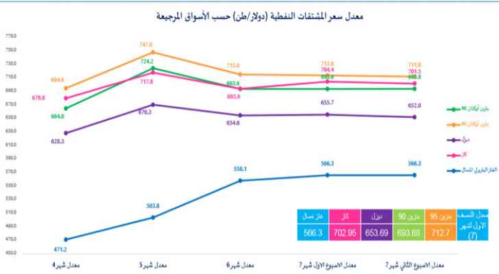 اما سعر البنزين اوكتان 95 فقد انخفض بنسبة 3ر0% هذا الاسبوع عن الأسبوع الأول مسجلا أدنى سعر له يوم الخميس وبلغ 9ر691 دولارا للطن وأعلى سعر يوم الثلاثاء الماضي عند 5ر730 دولارا، بينما عادل سعر البنزين اوكتان 90 هذا الأسبوع معدل الاسبوع الماضي من هذا الشهر مسجلا أدنى سعر هذا الأسبوع يوم الخميس 5ر673 دولارا للطن وأعلى سعر سجل كان يوم الثلاثاء وبلغ 2ر712 دولارا مع ثبات سعر الغاز المسال عند 25ر566 دولارا للطن بنسبة ارتفاع بلغت 4ر1% عن سعره لشهر حزيران الماضي.