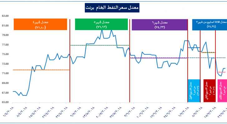 شهد الأسبوع الثالث من شهر تموز الحالي انخفاضا ملحوظا في أسعار النفط الخام والمشتقات النفطية، فانخفض سعر خام برنت القياسي من 84ر75 دولارا للبرميل الى 35ر71 دولارا بنسبة 6% مقارنة بالأسبوع الثاني ووصل سعر برنت إلى حدود 6ر70 دولار للبرميل يومي الثلاثاء والأربعاء الماضيين مسجلا بذلك أدنى سعر له هذا الشهر ليعود ويرتفع يومي الخميس والجمعة الى 16ر72 دولارا.