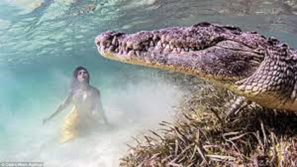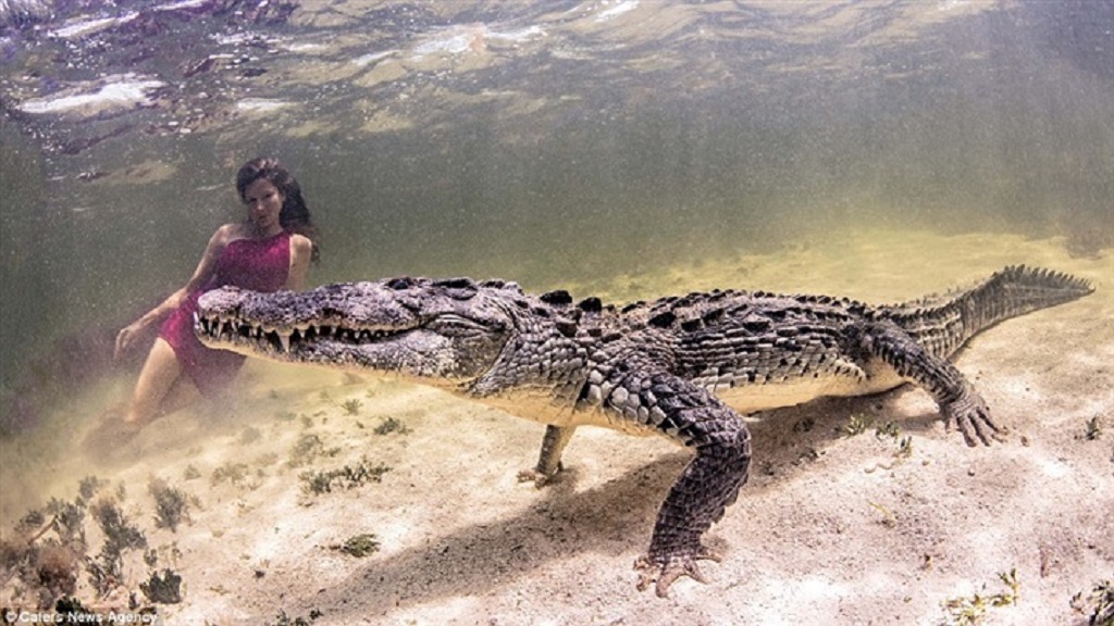 بالصور .. عارضة ازياء تغامر بحياتها مع تمساح