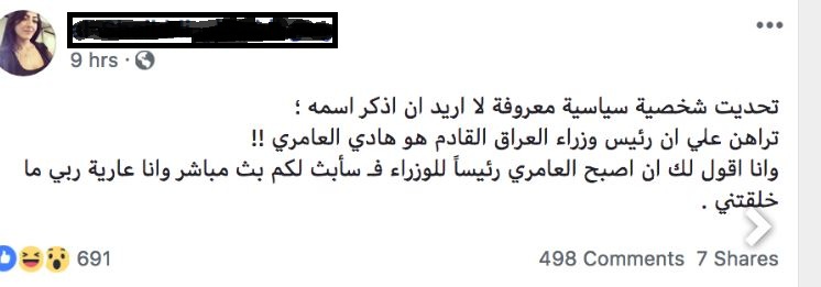 ونشرت الكاتبة السياسية ال (ش )، مشاركة على صفحتها الرئيسية على موقع التواصل الاجتماعي فيسبوك تضمنت :"شخصية سياسية معروفة لا اريد ان اذكر اسمه ؛ تراهن علي ان رئيس وزراء العراق القادم هو هادي العامري !!